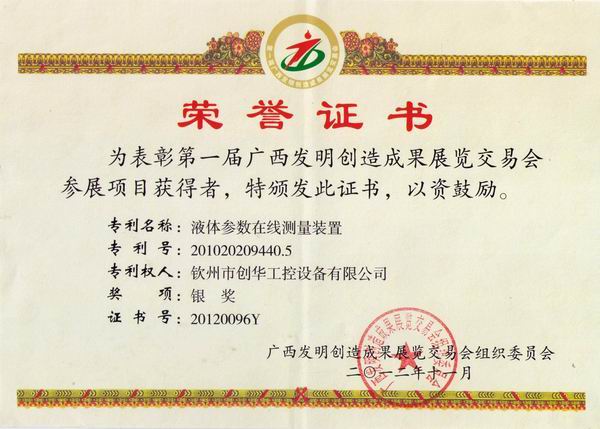 2012年12月我公司喜獲由廣西發(fā)明創(chuàng)造成果展覽交易會組織委員會頒發(fā)的“廣西發(fā)明創(chuàng)造獎銀獎”。 我公司榮獲參展獎項:液體參數(shù)在線測量裝置,該測量裝置配套到pH自控系統(tǒng),將提高測量的準確性,保證系統(tǒng)的穩(wěn)定性,整體結構簡單可靠、一目了然,克服以往裝置結構復雜、故障率高、維護量大等缺點。