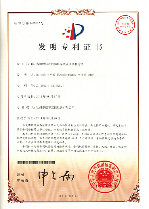 2014年8月20日,我公司自主研發(fā)的“煮糖物料在線稀釋系統(tǒng)”榮獲國家發(fā)明專利授權(quán)。截止目前,我公司已獲國家發(fā)明專利授權(quán)3項(xiàng),實(shí)用專利授權(quán)5項(xiàng)。