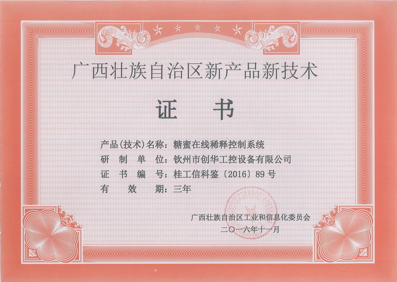 項(xiàng)目針對(duì)糖廠結(jié)晶工段糖蜜稀釋工序無(wú)法按需連續(xù)稀釋、溶晶不徹底、溫度波動(dòng)大,影響產(chǎn)品質(zhì)量和糖分回收的現(xiàn)狀,研發(fā)出“糖蜜在線稀釋系統(tǒng)”,實(shí)現(xiàn)了糖蜜稀釋過(guò)程中溶晶徹底,錘度和溫度有效控制,使結(jié)晶罐能做到沸點(diǎn)連續(xù)入料。項(xiàng)目產(chǎn)品“糖蜜在線稀釋系統(tǒng)”獲得廣西壯族自治區(qū)工業(yè)和信息化委員會(huì)委頒發(fā)的新產(chǎn)品新技術(shù)證書(shū)。